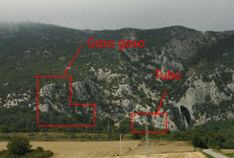 A1 salida Egino, se ve la cueva de la lece, cartel indicativo en el cruce