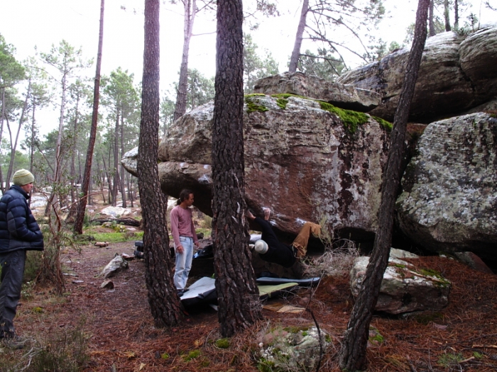 Cogemos el camino ancho (GR 10) que sale desde el parking 2 (techado) y lo seguimos en dirección al recorrido de pinturas rupestres. Pasaremos por dos desviaciones que no tomaremos. Pues después de la segunda desviación encontraremos una curva a la izquierda de 180º. El la mitad de la curva subiremos hacia la derecha monte a través por una vaguada. Unos 500 o 700 m más adelante encontraremos una hilera de piedras a nuestra derecha como si fuera un muro. Al final de esta hilera hay un techo muy característico con un 7c+/8a (Zatoichi) y un 7a (Máximo exponente) a su izquierda. Es a partir de aquí donde empieza el sector Valle de la Madera... Suerte!!!