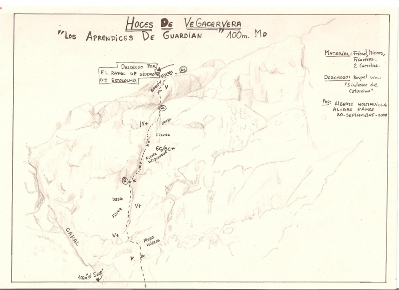 Tres largos. El primero de V+ totalmente desequipado. El segundo tiene algunas chapas, pero hay que complementar el euipamiento con friends y fisureros, 7a. Es una bonita babaresa desplomada. La reunión se monta antes del último muro. El tercer largo es un corto muro vertical de huecos que da salida a una bonita fisura, V+.