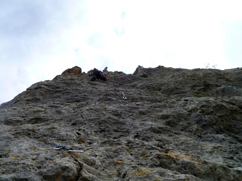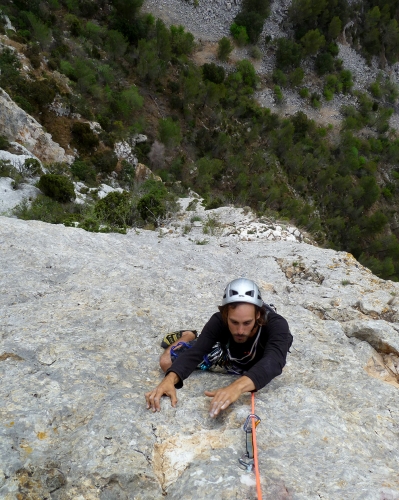 Salimos por la derecha de la reunión, en diagonal ascendente hasta encontrar una estética y fina babaresa de roca blanca. La seguimos hasta su fin y tras una corta travesía a la derecha seguimos por unos pasos desplomados con mucho canto con tendencia a la izquierda.