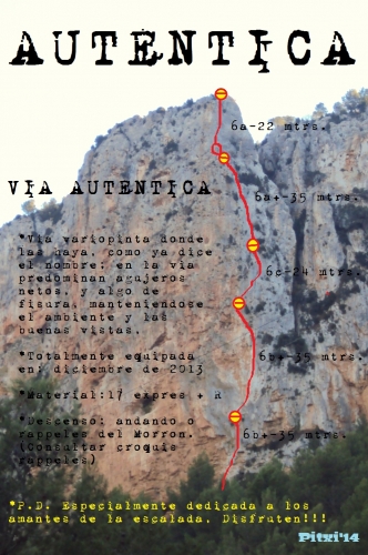 Recorre el espolón noroeste, con lo cual ya se sabe, sombra casi todo el día, perfecta para verano. Los grados no son Montanejeros, y el tipo de roca es excepcional.