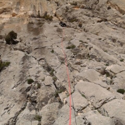 Un largo bastante mantenido que supera algunos trozos de roca naranja ligeramente desplomados. Se puede empalmar con el siguiente.
