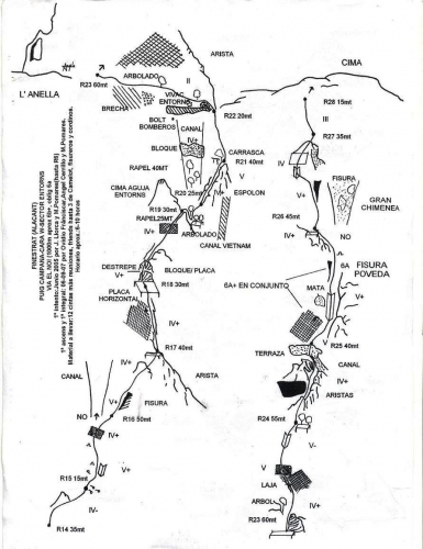 Asciende hasta lo alto de la aguja y realiza una travesía hacia delante por un tramo de cresta común con la vía Entorns. Supera un paso estrecho entre la pared y un gran bloque, sorteando también algún árbol y continúa con tendencia a la derecha hasta una reunión semicolgada de varios clavos.
