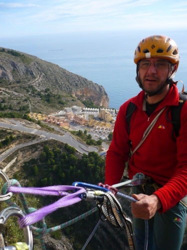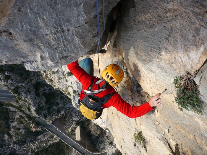 Partiendo de la barandilla del puente, seguir en travesia ascendente hacia la izquierda unos ganchos de hierro, cruzar la terraza por encima de la malla de protección y remontar un poco hasta el pie de la pared, donde encontraremos la primera reunión.