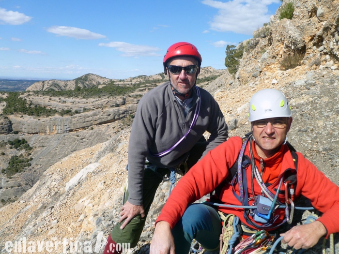 Nos subimos al espolón y lo seguimos durante casi 60 metros. Iremos encontrando parabolts y alguna sabina pero hay que navegar entre ellos por terreno fácil. Largo con muy buen ambiente. Al final llegaremos a una repisa donde encontraremos la reunión bajo otra placa
