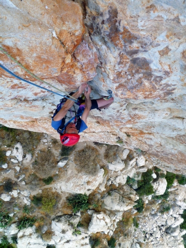 Salimos por la izquierda de la reunión por una especie de canalizo donde nos introducimos en una bóveda de la que saldremos por una serie de repisas romas hacia la izquierda con pasos desplomados pero sencillos, con abundante canto. La roca está marcada de negro por el efecto de la goma de los pies de gato. Encontraremos dos o tres parabolts en todo el largo que nos confirman el camino por el terreno más evidente.