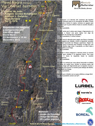 Escalar la fisura diagonal a derechas hasta la mancha naranja, para cambiar a la siguiente fisura. Tras unos metros, ir hacia la izquierda hasta la reunión (inscripciones).