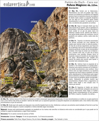 Las escaladas en el Peñón de Ifach se caracterizan por ser muy aéreas y con mucho patio, sensación que aumenta al tener el mar bajo nuestros pies. Encontraremos vías de varios largos equipadas, semiequipadas y limpias que nos harán disfrutar de una escalada clásica y/o artificial sin comparación por estos lares. La roca caliza de color rojo pondrá aprueba nuestro factor psicológico, especialmente en los primeros metros, dado que el salitre le da un tacto poco adherente.