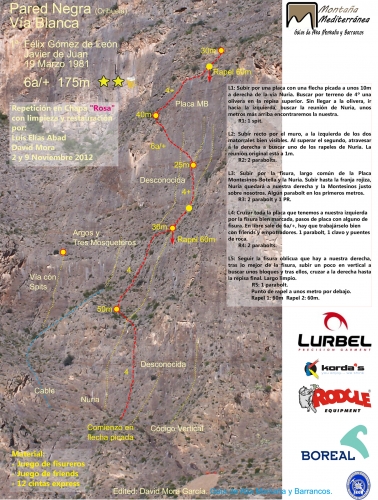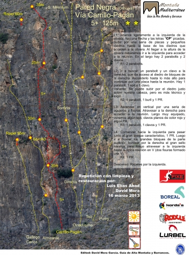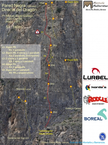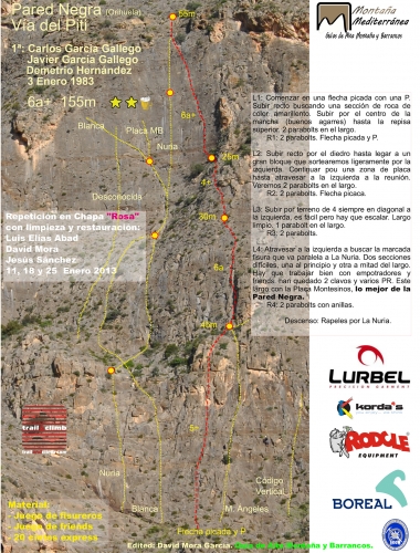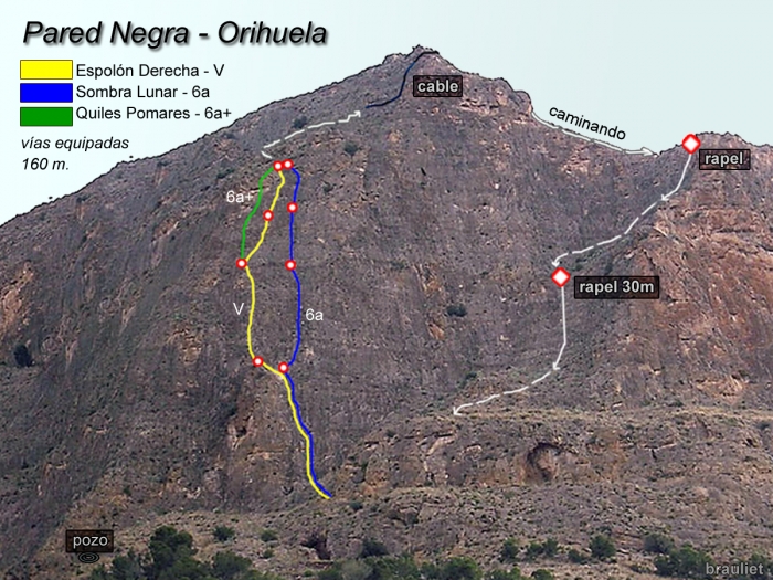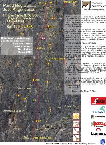 En la Pared Negra podemos encontrar alrededor de 30 itinerarios de características muy similares, con una dificultad moderada (en torno al V/6a) debido a la ligera inclinación que ofrecen sus placas, que rara vez alcanzan los 90º.