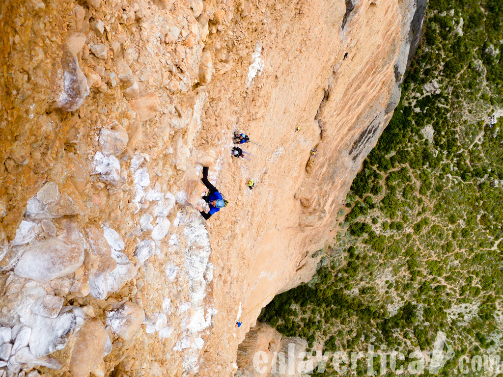 - Debido al gran desplome la lluvia prácticamente nunca moja la pared y el magnesio se acumula. Foto tomada durante la cuarta edición del Rally 12 horas Tech Rock de Riglos 2012