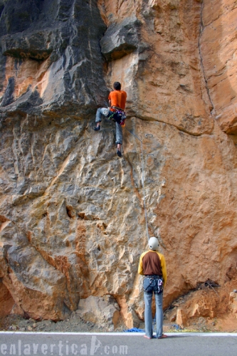 • (L1) Pie de vía - Merli asegurando a Will desde la misma carretera en los primeros pasos de la vía tras abandonar los escalones de la ferrata de acceso.