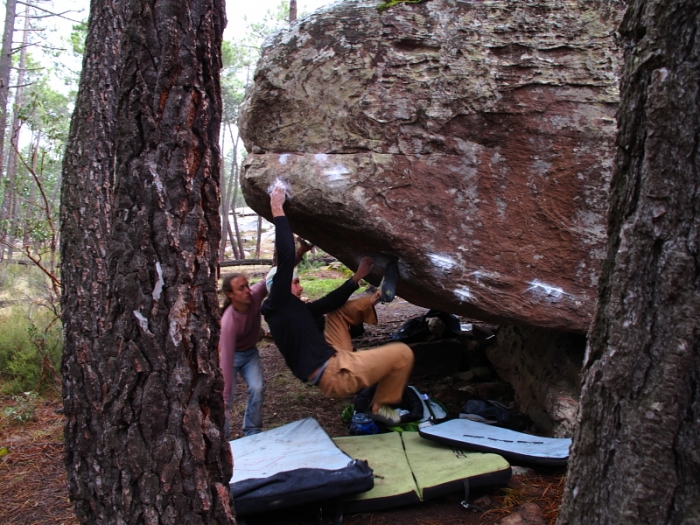 Cogemos el camino ancho (GR 10) que sale desde el parking 2 (techado) y lo seguimos en dirección al recorrido de pinturas rupestres. Pasaremos por dos desviaciones que no tomaremos. Pues después de la segunda desviación encontraremos una curva a la izquierda de 180º. El la mitad de la curva subiremos hacia la derecha monte a través por una vaguada. Unos 500 o 700 m más adelante encontraremos una hilera de piedras a nuestra derecha como si fuera un muro. Al final de esta hilera hay un techo muy característico con un 7c+/8a (Zatoichi) y un 7a (Máximo exponente) a su izquierda. Es a partir de aquí donde empieza el sector Valle de la Madera... Suerte!!!
