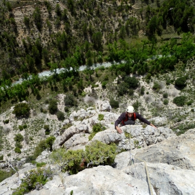 La vía originalmente comienza a la derecha de la linea de parabolts de la vía Teruel existe pero parece que actualmente se le está entrando por estos parabolts, por un tramo vertical sobre romos bastante interesante. Al llegar a la repisa abandonaremos los parabolts para seguir unos metros a su derecha a buscar la primera reunión en un árbol.