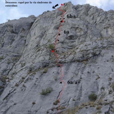 Vía situada a unos 200 metros del sector de deportiva. Tres largos de cuerda. El decenso por la vía no está equipado. Es obligada en el 6b.
