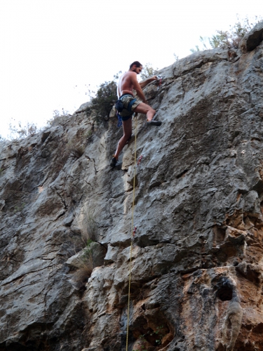 Vía mantenida con buenos cazos, supera un par de desplomes y termina con una afilada laja.