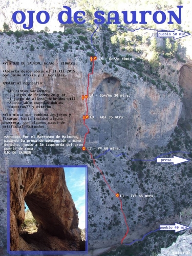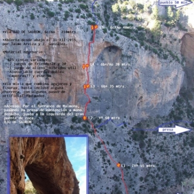 Vía mixta que combina agujeros y fisuras, hasta incluso alguna chorrera, con algunos pasos de artificial equipados.