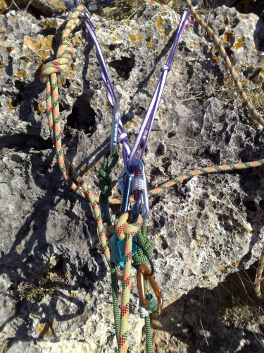 Montamos un rapel de 60m con dos cuerdas unidas con un pescador doble y rapelamos en doble con el ocho asegurado con nudo de prusik.