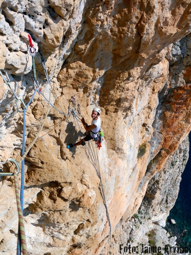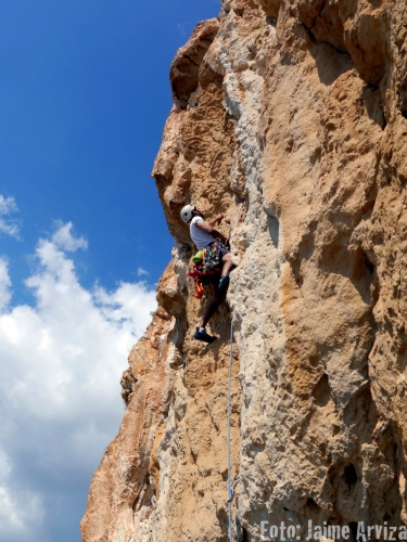 Se sube en tendencia a la izquierda para superar el primer muro desplomado (un bolt).(6a+) Superado este se hace travesía a la izquierda hasta una pequeña bóveda que se supera en vertical debiendo equipar el tramo (6a+). Se continua ahora hacia la izquierda hasta un puente de roca y primero con tendencia a la izquierda y luego a la derecha se supera un muro ligeramente desplomado al principio y vertical después con agarres romos (6b). 25-30 m.