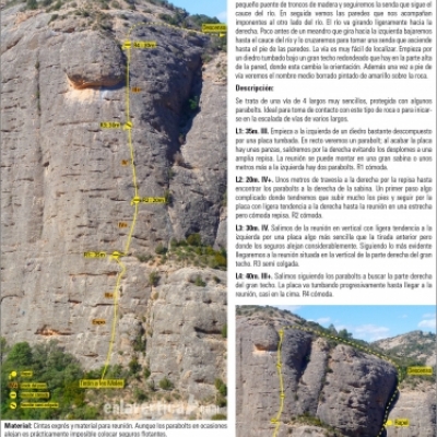 Se trata de una vía de 4 largos muy sencillos, protegida con algunos parabolts. Ideal para toma de contacto con este tipo de roca o para inicarse en la escalada de vías de varios largos.